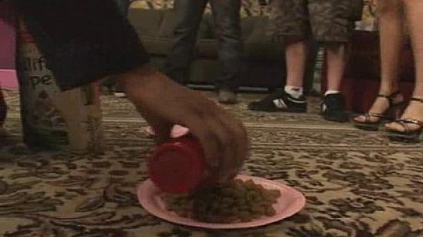 3 small titted sluts sucking and jerking off one lucky guy's cock until they get cum on their faces